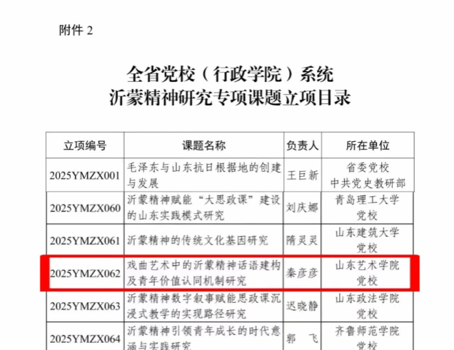 近日,中共山东省委党校(行政学院)公布了2025年度全省党校(行政学院)系统课题立项名单,学校申报的“戏曲艺术中的沂蒙精神话语建构及青年价值认同机制研究”获立项。