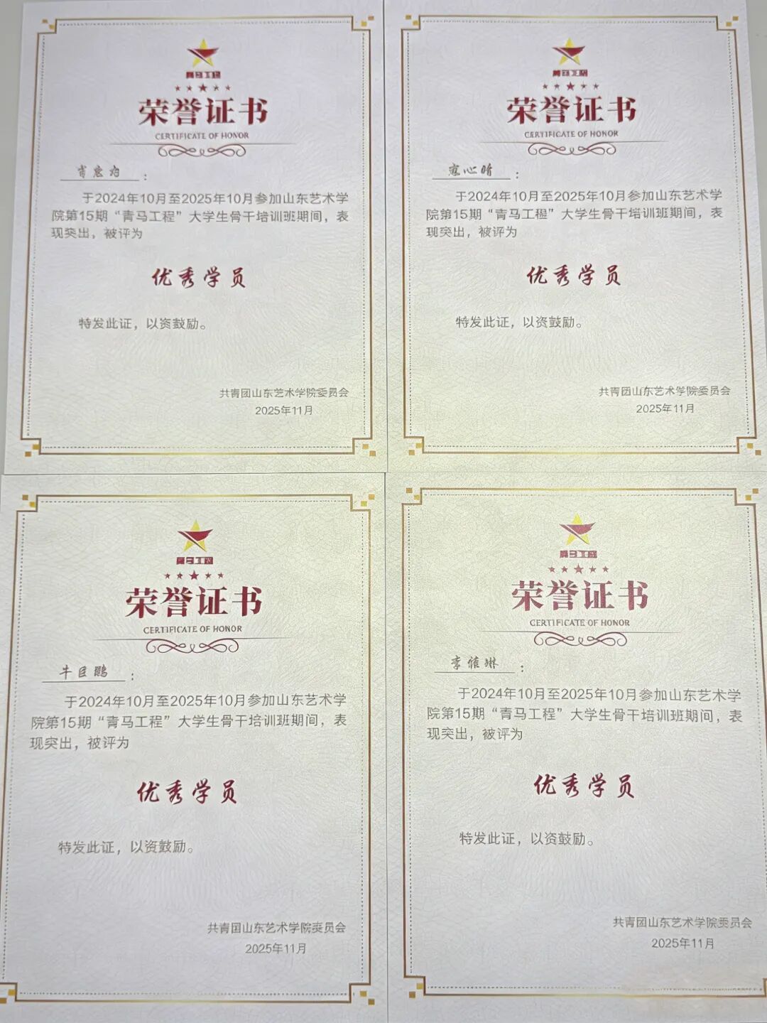 肖惠匀、寇心晴、牛臣鹏、李雅琳表现优异,被评为“优秀学员”。