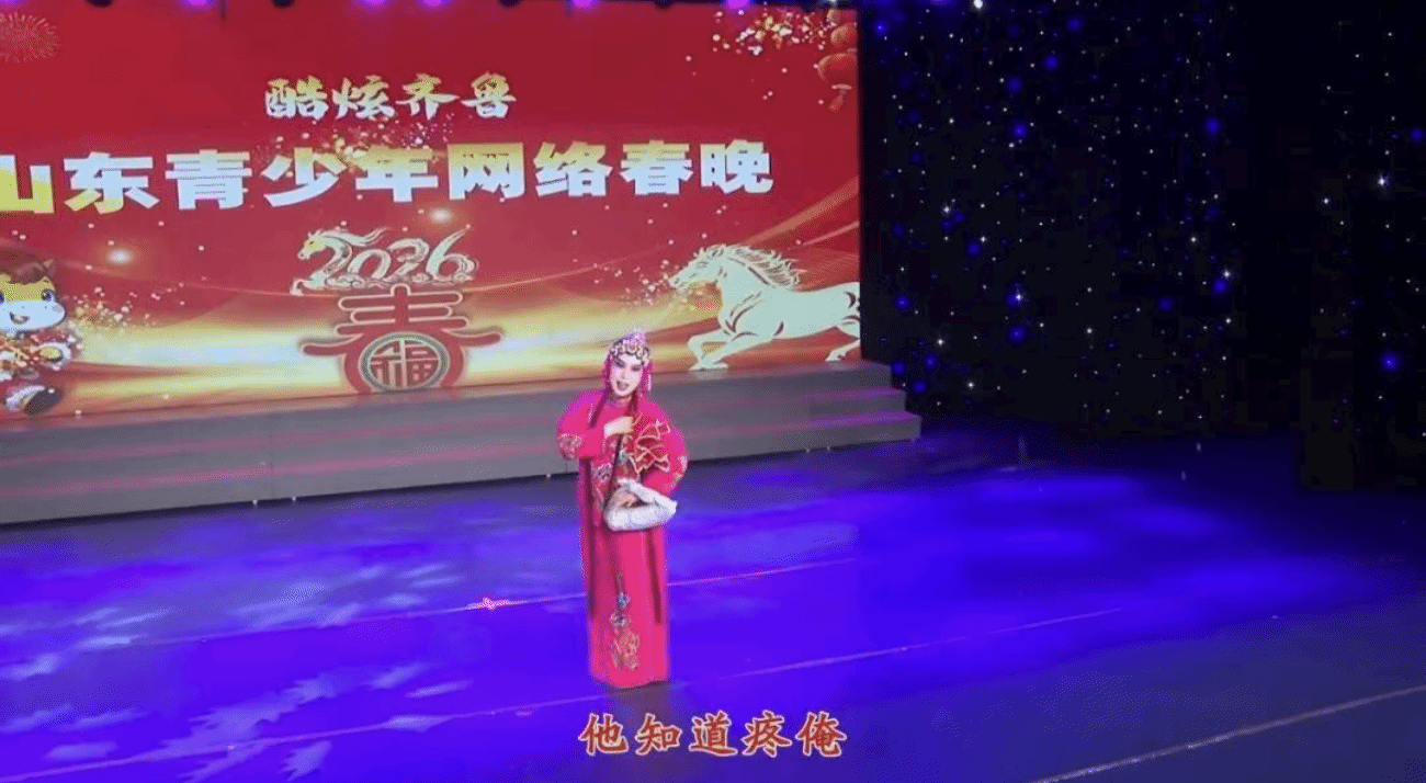 2月10日(腊月二十三),学院2024级戏曲表演班学生崔旖洺参与山东青少年网络春晚,表演吕剧《王小赶脚》选段。